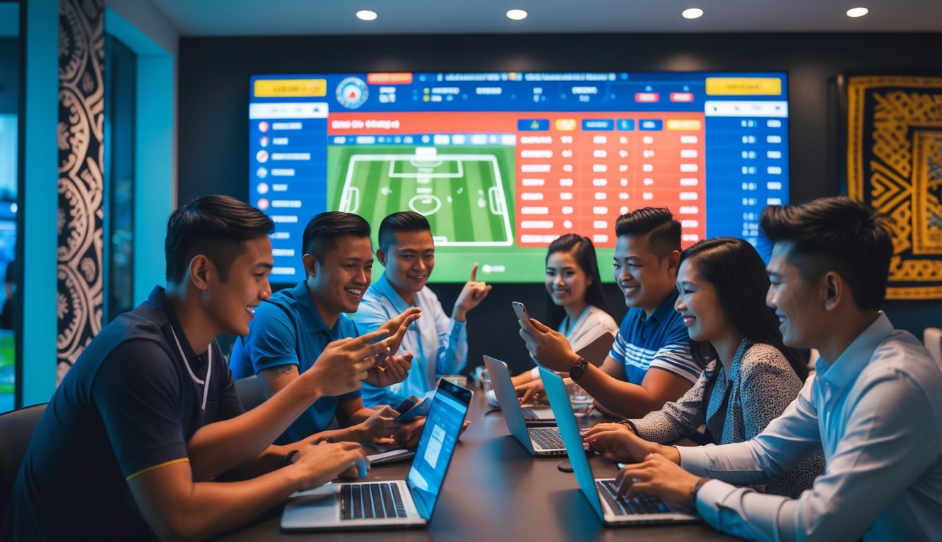 Sekelompok orang sedang menggunakan perangkat digital untuk bertaruh sepak bola dengan latar layar besar menampilkan statistik pertandingan.