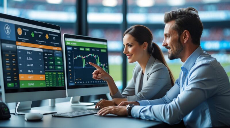 Seorang pria dan wanita duduk di meja modern sambil melihat layar komputer yang menampilkan statistik dan peluang taruhan bola.