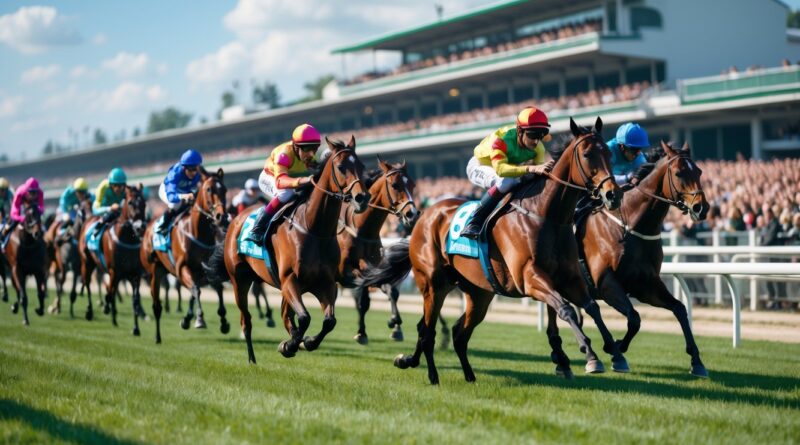 Adegan balap kuda dengan beberapa kuda dan joki yang sedang berlari cepat di lintasan balap, dikelilingi oleh penonton yang antusias.