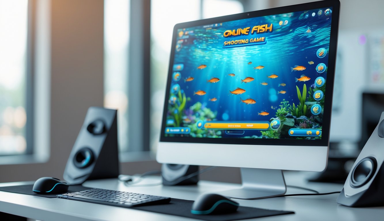 Sebuah komputer desktop menampilkan permainan tembak ikan dengan latar belakang kantor modern yang terang.